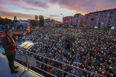 “Tabii 19 aydır çalışıyorlar. 19 aydır Ayşe Ünlüce olmadık bir işi başarmaya, Yılmaz Büyükerşen’i aratmamaya çalışıyor. Gençler istedi, 24 saat ulaşım ve abonman kartını hayata geçirdiler. Üniversiteli kız öğrencilere misafirhane, emeklilere kafe açtılar. İki kent lokantası, var olanın üzerine yedi kilometre daha bisiklet yolu yaptılar. Aşevi var ya aşevi, hocamın aşevi. Pandemide hesaplarına el koyup kapatmaya çalıştıkları aşevi, bütün Eskişehir’de sıcak yemek yemek isteyenlere, yoksullara gıda oluyor. Hocam için de dua oluyor. Bu güzel hizmeti hepimiz bir kez daha yürekten alkışlıyoruz. 65 yaş üstü hastalara evde temizlik ve bakım hizmeti, çocuklara kırtasiye, beslenme, çanta destekleri sağlandı. 272 bin ton asfalt son 19 ayda üretildi, 70 kilometre asfalt serildi. Kırsal yollarda 231 kilometre sathi kaplama yapıldı. 7 bin çiftçiye tohum, gübre ve fide dağıtıldı. 2 milyon metrekare atıl tarım arazisi üretime katıldı. 300 milyonluk yatırımla 2038 yılına kadar Eskişehir’imizin katı atık sorunu kökünden çözüldü. Halk Et ile uygun fiyatlı et satışına başlandı. Yeni şubeler geliyor. Emek Mahallesinde 120 dönümlük Emek Park açıldı. Kent ulaşımına metrobüsler geliyor. Alkışlar Ayşe Ünlüce için geliyor. Tabii bizim başkanlarımız, 6 belediye başkanımız 8’e çıktı bu dönem. Büyük bir başarı kaydettik. Hepsiyle ayrı ayrı gurur duyuyoruz. Biz Eskişehir’i tanıyoruz, biliyoruz, sesine kulak veriyoruz. Ama vatandaştan oy istemeye gelince yüzünü dönen, sonra sırtını dönüp giden bir iktidar var. Eskişehir’in ölüm yollarına dönen ilçeler arası yollarında, üstlerine düşeni halen daha yapmadılar. Çevre yolu yapacaklardı, yapmadılar. Havalimanı var, tarifeli sefer yok. Osmangazi Tıp Fakültesi Hastanesi’nde depreme dayanıksızlık var. Risk büyük, çalışma yok. Devlet okulları depreme dayanıksız, acil dönüşüm için genel iktidarın harekete geçmesi lazım, yapılan bir iş yok. Biz hayırseverleri, Eskişehir’in hayırseverlerini harekete geçirirken bir türlü bakanlığı Eskişehir’e yatırım için harekete geçiremiyoruz. Belediyelerimiz eliyle çağdaş bir kente dönüştürülen Eskişehir’e bu sorunlar yakışmıyor. Bundan sonra AK Parti’ye ‘Bu sorunları çöz’ demeyeceğiz. Yakamızdan düşsünler. Geliyoruz, hepsini biz çözeceğiz.”