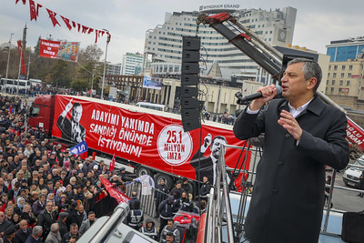 “Ve şimdi bu işler ilk başladığında, dokuz ay önce hatırlıyor musunuz Ramazan Bayramı’nın ilk günü sabahı, Trabzon’a gitmiştim. Ekrem Başkanların köyüne varmıştım. Bayram namazından sonra kapı önüne çıkmıştım köyün en yaşlılarından başlayarak bir imza kampanyası başlatmıştım. Hatırlıyor musunuz? Orada ne diyorduk, Ey Erdoğan, adayımı bırak, sandığı getir. Adayımı yanımda, sandığı önümde istiyorum.’ Siz bu imzayı attınız mı? İmza atanlar bir alkış yapsın, duyayım. Sizin Türkiye’de 81 ilde 973 ilçede bütün sizlerin emekleri ile, gönüllülerimizin emekleri ile adayın serbest bırakılmasını, erken seçim isteyen, istediğini söyleyenlerin imzalarını dokuz ay boyunca topladık. Geçen hafta kurultaydaydı, ilk kez Kayseri Meydanı’nda. 25,1 milyon imza. Adayımı yanımda, sandığı önümde istiyorum. Türkiye’de dünya siyasi tarihinin en büyük imza kampanyasına yüreğini koyanlara bir alkış. Bu kampanyaya evladı devlet memurluğu sınavına girecek diye, gönlünü koyup imzasını koyamayanlar, torununun geleceği kararmasın diye korkusundan imzasını koyamayan, gönlünü yüreğini koyanlar var. Dünyada son seçimlerde AK Parti 19 milyon oy aldı. 6 milyon fazlası bu TIR’da var. Türkiye’deki seçmenlerin neredeyse yarısına yakınının imzası bu TIR’ın içinde var. Buradan Erdoğan’a sesleniyorum. Bu millet seni sandığa çağırıyor. Cesaretin varsa gelirsiniz, Meclis’te kararı alırız. Kış geçer, mart ayında sandığı koyarız. Millet görevi sana verirse, biz buna saygı duyacağız. Ama bu milletten aldığın ve bu yaptıklarınla milleti pişman ettiğin, bezdirdiğin, seçmene yaka silktirdiğin ortada. Geldiğin sandığı inkar ediyorsun. Erdoğan bu TIR’ın içinde 25,1 milyon kişi diyor ki; ‘Getir sandığı, kararı biz vereceğiz.’”