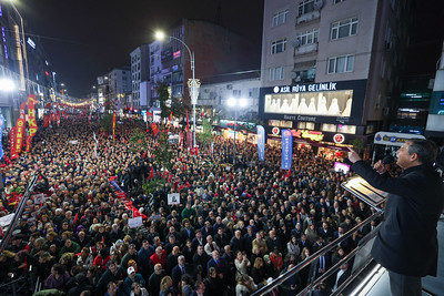 “Değerli Ümraniyeliler, 19 Mart darbesinin üzerinden tam 230 gün geçti. Yani AK Parti’nin siyasette havlu atmasının, ‘Ben bu yarıştan çekiliyorum’ demesinin üstünden 230 gün geçti. Güya yenilmez biri vardı, 23 senedir sürekli kazanıyordu. ‘Siyasette ben yenilmem’ diyordu. 31 Mart seçimine kadar kurduğu partisi hep birinci partiydi. Kendisi de girdiği her seçimin kazananıydı, bununla övünüyordu. Ama hesaba katmadığı bir şey vardı. Bu milletin tepkisini hesaba katmadı. İlerleyen yaşına rağmen geçmişte kendinden yaşlı siyasetçilere en ağır şeyleri söyleyen, Erbakan hocaya ‘Yaş 70, iş bitmiş’ diyen Erdoğan, bugün ölüm yıldönümü olan rahmetli Ecevit’e ‘Ölünce mi bırakacaksın be adam?’ diye haksızlık yapan Erdoğan bugün onların yaşında. Millet hizmet bekliyor. Millet verdiği oyun karşılığını, alın terinin karşılığını, yıllarca verdiği emeğin karşılığını bekliyor. Sadece kendine yakın çevrelere sahip çıkan, onların vergi borçlarını affeden, zenginin dostu olan, garibana dönüp bakmayan Erdoğan sizi hesap edemedi. Genç kadrolarımızla, onca kadın adayımızla, dinamik ekibimizle birlikte Erdoğan’ı ve kurduğu partisini 31 Mart’ta yendik. Cumhuriyet Halk Partisi, Türkiye’nin birinci partisi oldu.”