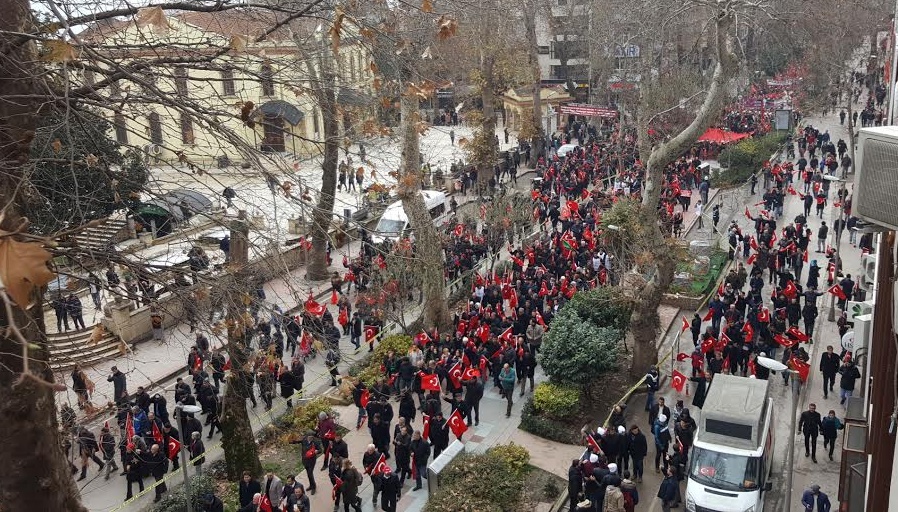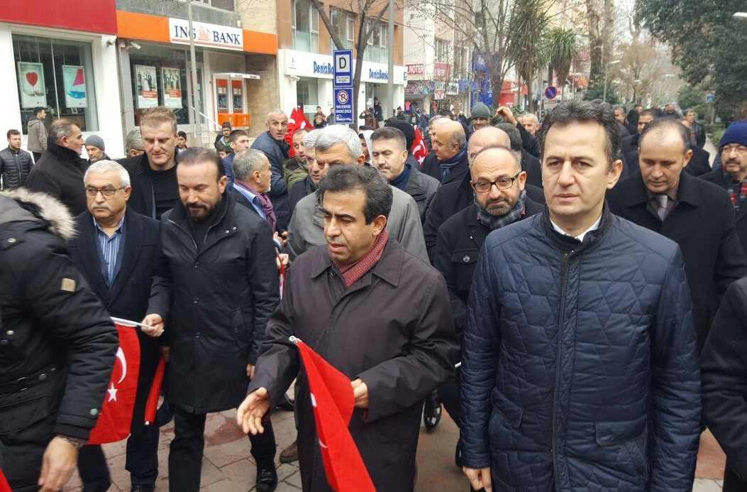 ar teröre karşı tepkilerini slogan atarak gösterirken, yaklaşık 20 metrelik Türk bayrağı da açıldı. Yürüyüş sonunda İl müftüsü Yusuf Doğan şehitler için Kuram-ı Kerim okuyarak dua etti.